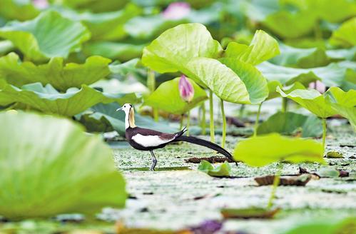 截至目前,白洋淀野生鳥類增加至296種。圖為7月7日拍攝的水雉在白洋淀棲息覓食。河北日報記者 劉光昱攝