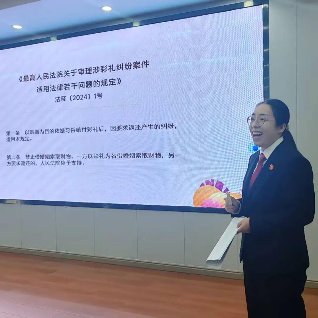 活動現(xiàn)場,干警聚焦兩大主題,以通俗易懂的方式開展宣講。在“弘揚婚嫁新風”環(huán)節(jié),法官以《最高人民法院關于審理涉彩禮糾紛案件適用法律若干問題的規(guī)定》為背景,結合三個典型案例,深入淺出地講解了群眾關心的彩禮問題,著力宣傳民法典關于“禁止借婚姻索取財物”的規(guī)定,引導村民樹立正確的婚戀觀,共同倡導文明鄉(xiāng)風建設。