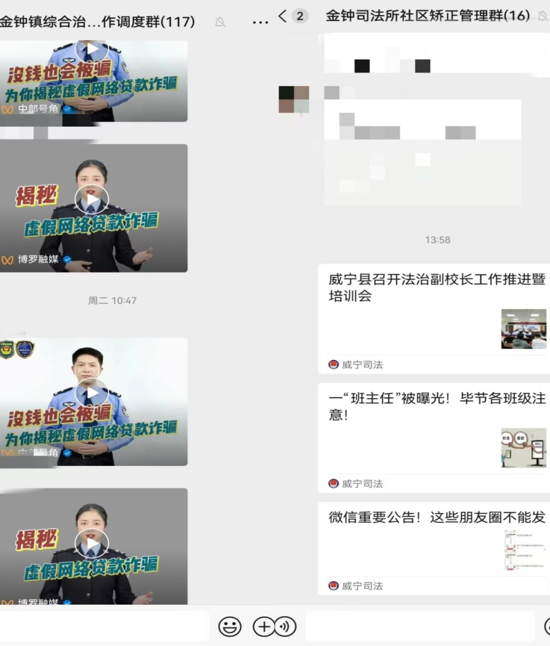 借助微信群的便捷性,金鐘司法所建立了多個微信工作群,定期推送法律條文解讀、典型案例分析等內(nèi)容,為群眾提供了一個便捷、高效的線上學(xué)習(xí)平臺。同時,司法所工作人員針對微信群里群眾咨詢的法律問題及時解答,形成了良好的互動交流氛圍。2023年以來,金鐘司法所通過微信工作群轉(zhuǎn)發(fā)普法案例及短視頻近1萬條,覆蓋2萬余名群眾。