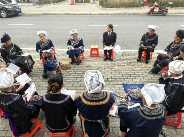 “重婚有違民法典,包辦買(mǎi)賣(mài)不對(duì)路,朝三暮四不可取,養(yǎng)老育兒是義務(wù)?!崩C娘們創(chuàng)作的普法水歌生動(dòng)有趣。在雪花湖社區(qū)“繡娘之家”,繡娘們坐在板凳上一邊刺繡一邊興致勃勃地唱著。韋應(yīng)麗介紹說(shuō):“在水鄉(xiāng),群眾愛(ài)唱歌但識(shí)字不多,學(xué)習(xí)法律有困難。所以我們的繡娘不僅要成為矛盾糾紛調(diào)解的行家,更要成為合格的普法員?!崩C娘們將國(guó)家法律法規(guī)和政策編排成“調(diào)解歌”“新時(shí)代女性歌”“孝老愛(ài)親歌”“禁毒防邪歌”等少數(shù)民族山歌,唱給群眾聽(tīng),讓大家一聽(tīng)就懂,多聽(tīng)還能跟著哼唱,對(duì)法律知識(shí)更感興趣,真正做到聽(tīng)得懂、記得住、用得上。