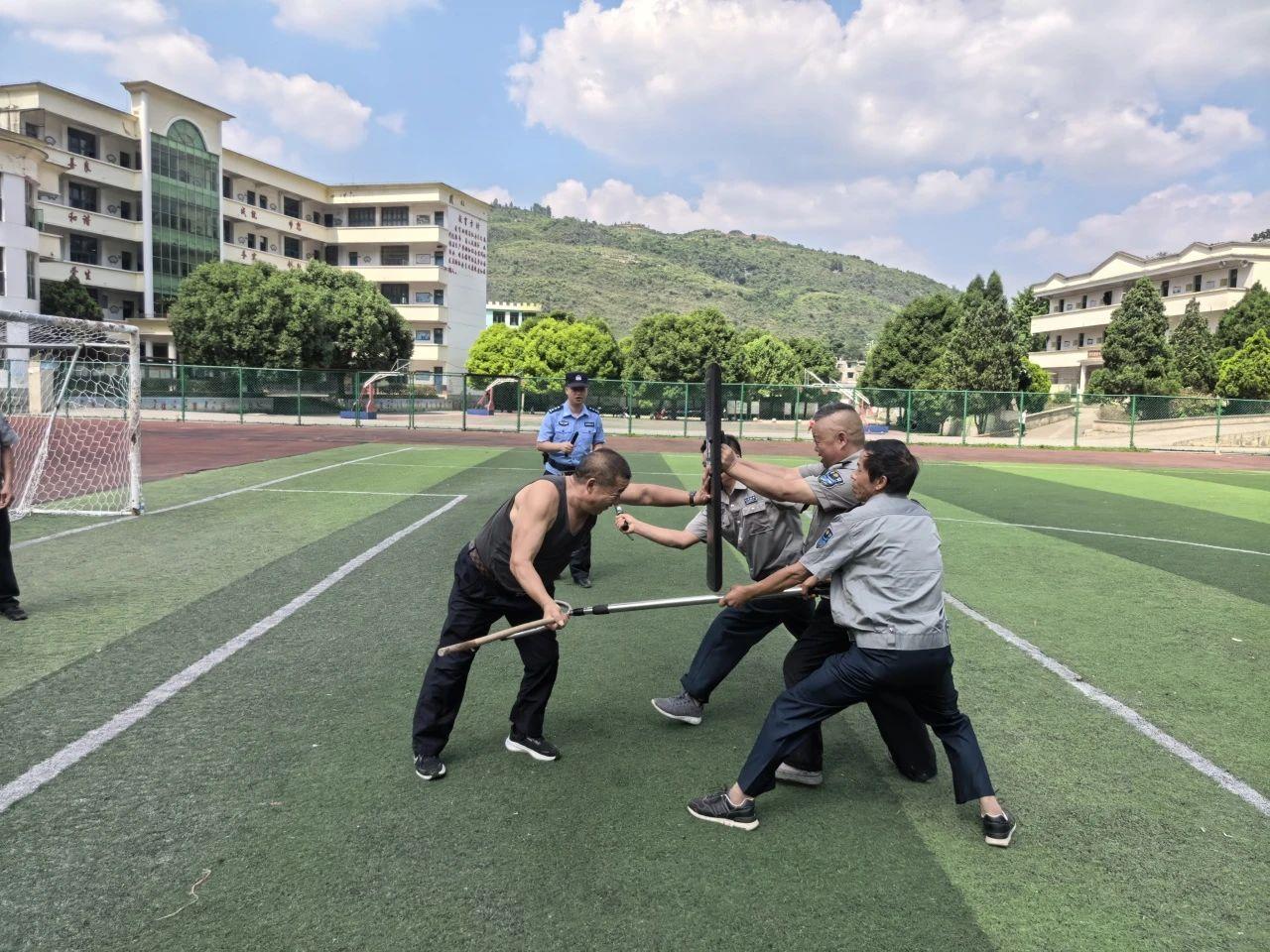 在實際操作環(huán)節(jié),民輔警們現(xiàn)場演示了盾牌、鋼叉、警棍等警用器械的正確使用方法,從握姿、站位到攻防技巧,每一個細(xì)節(jié)都講解得細(xì)致入微。隨后,民輔警們組織校園安保人員、教職工分組模擬各種突發(fā)場景開展實戰(zhàn)演練。各小組迅速反應(yīng),緊密配合,在持盾牌防御、持鋼叉控制、及時報警并疏散師生等方面,充分展現(xiàn)出“最小作戰(zhàn)單元”的高效協(xié)同能力。