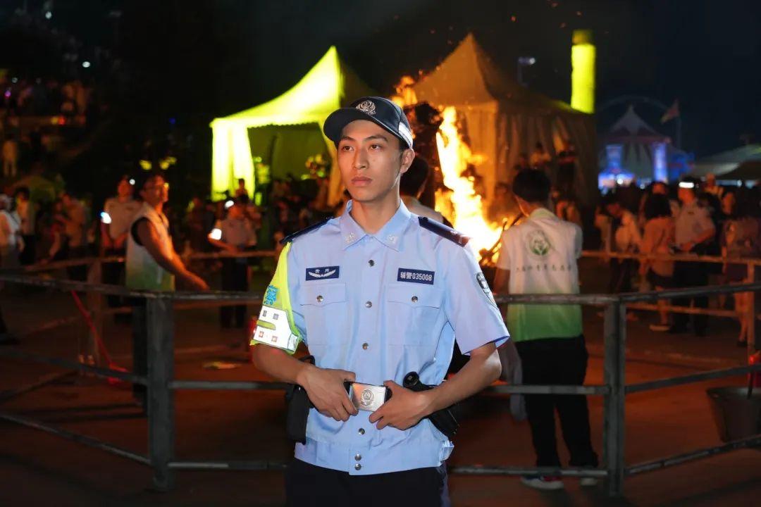 晚上10時(shí),九堆環(huán)形篝火被同時(shí)點(diǎn)燃,數(shù)千支火把剎那間將夜空映照得通紅熾烈。人潮隨著彝族達(dá)體舞的奔放節(jié)奏熱情涌動(dòng)、跳躍。此刻,彝族民警王偉旭正帶領(lǐng)巡邏小組在人流中穿梭,目光銳利如鷹,不放過(guò)任何一個(gè)安全死角?!绑艋鹞鑴?dòng)時(shí),必須保證游客處于火星噴射半徑之外,我們民警組成的這道‘隔離帶’,就是守護(hù)生命的安全線!”篝火管控組組長(zhǎng)崔恒的話語(yǔ)擲地有聲。