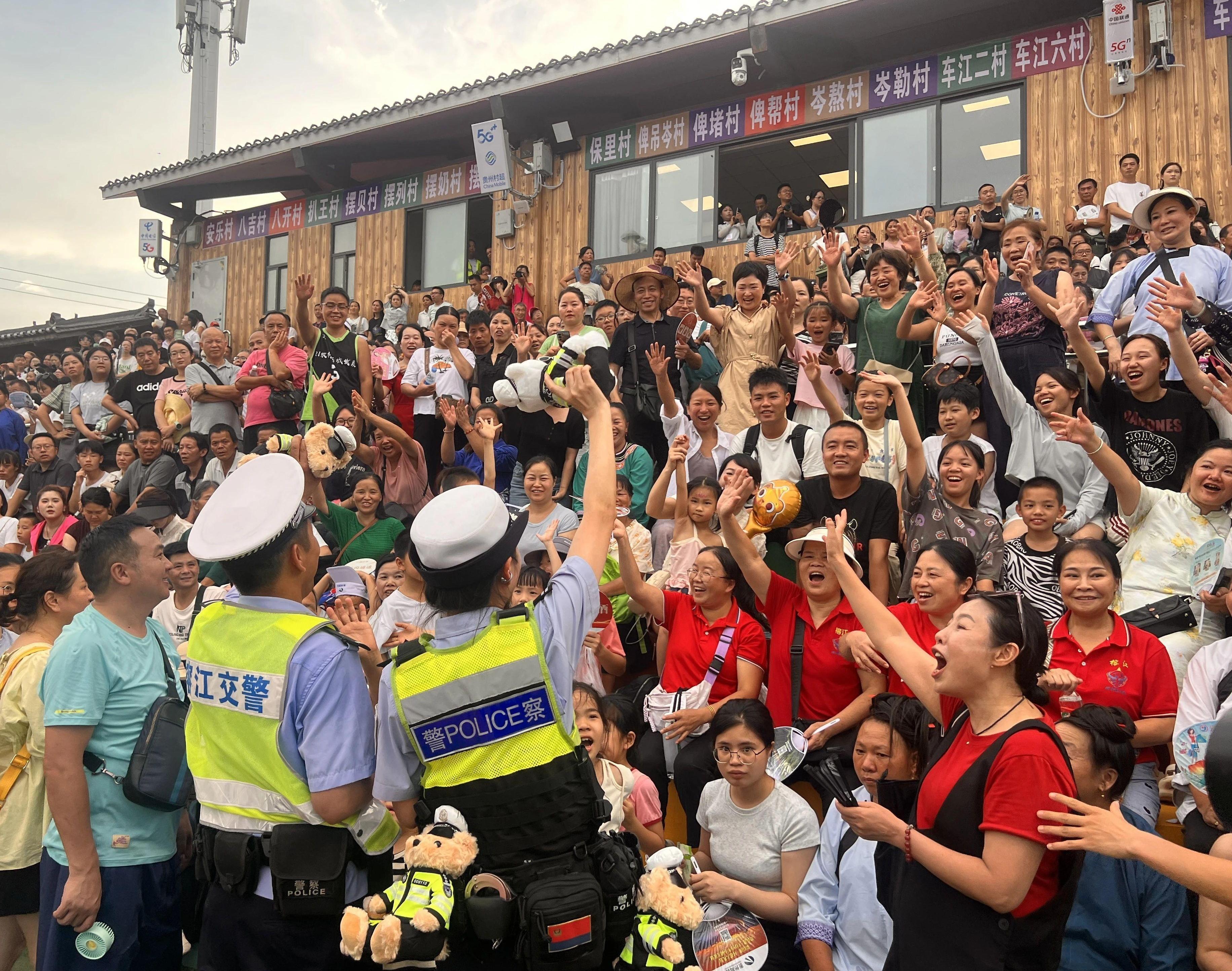 賽場(chǎng)內(nèi),球員們奮力拼搶,點(diǎn)燃激情;賽場(chǎng)邊,一抹特別的“熒光綠”“平安藍(lán)”同樣引人注目。貴州公安交管總隊(duì)聯(lián)合榕江交警,將交通安全課堂直接搬到了沸騰的觀眾席旁,“答題贏警用小熊”互動(dòng)區(qū)人頭攢動(dòng)。
