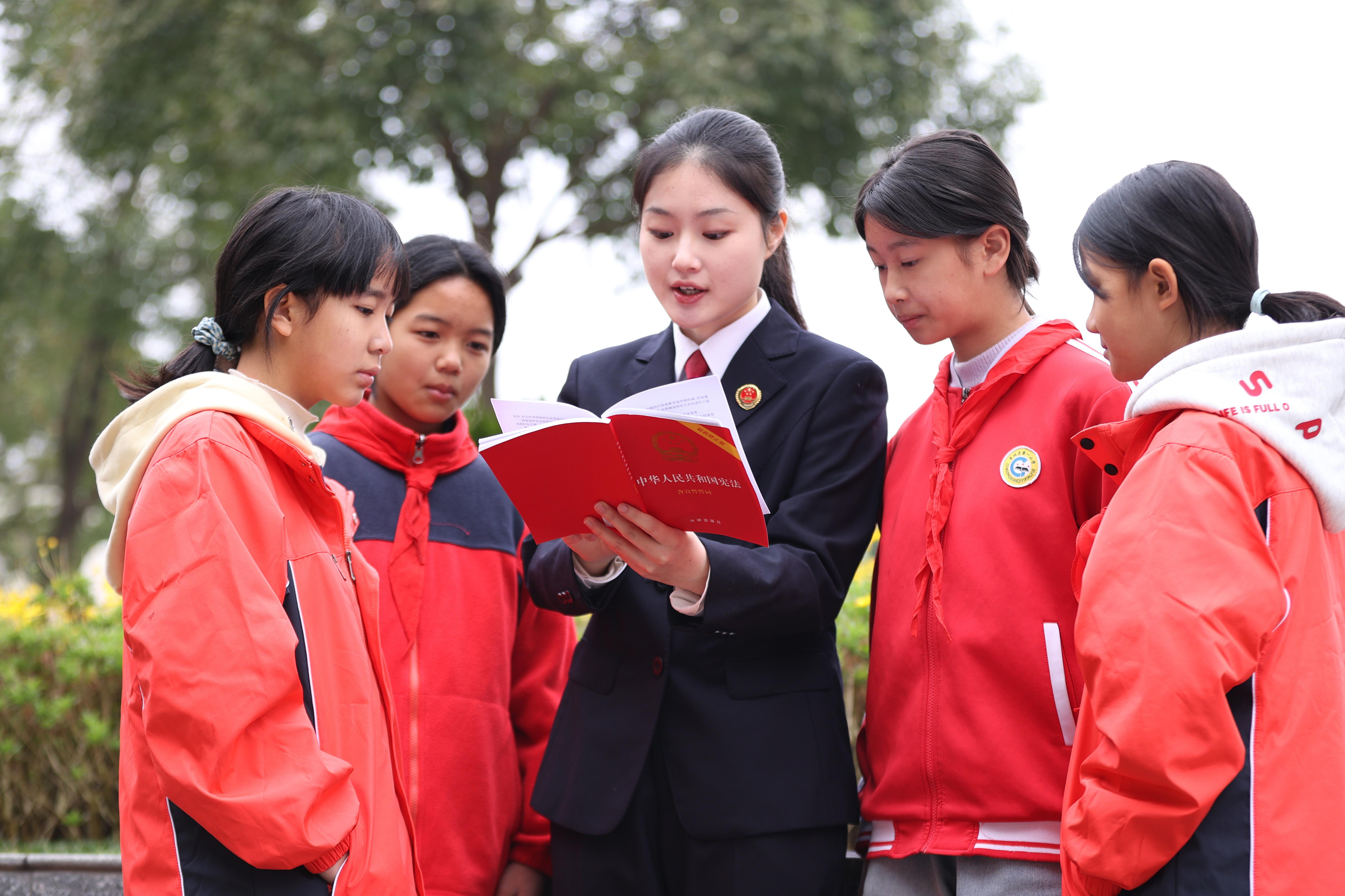 圖為為貴州省岑鞏縣檢察院檢察干警在該縣第一小學(xué)給學(xué)生講解憲法知識。