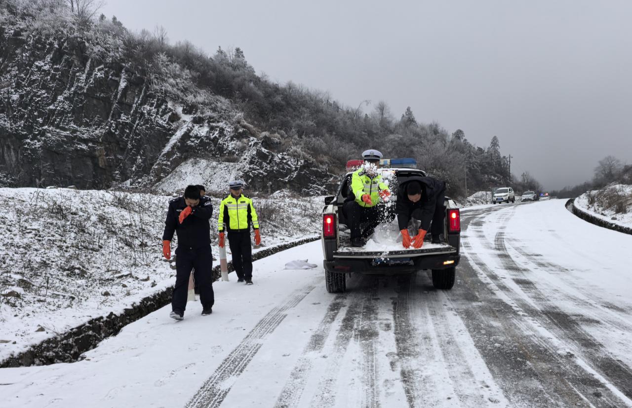 圖為務(wù)川公安交警撒鹽除冰。
