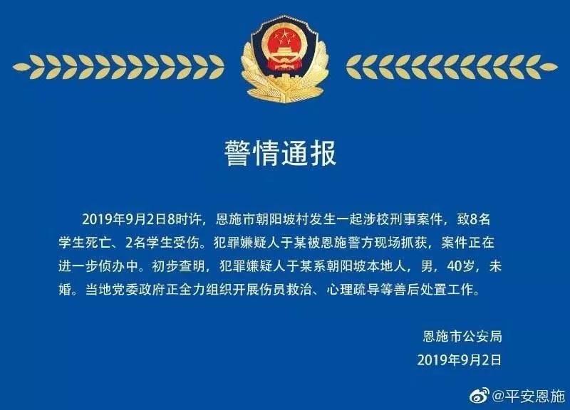 9月2日11時,湖北省恩施市政府官網(wǎng)發(fā)布通報稱,當(dāng)日8時許,恩施市白楊坪鎮(zhèn)朝陽坡小學(xué)發(fā)生一起傷人事件,有10名學(xué)生受傷。該消息經(jīng)主流媒體轉(zhuǎn)載后震驚輿論場,網(wǎng)民驚呼“血色開學(xué)日”。當(dāng)日晚22時,“@平安恩施”發(fā)布通報稱,目前有8名學(xué)生死亡、2名學(xué)生受傷,犯罪嫌疑人于某系本地人,40歲,未婚。通報發(fā)出不久被刪除,引發(fā)網(wǎng)民追問,官方信息管控措施遭到輿論批評。隨后,《南方周末》等媒體介入報道,有關(guān)嫌疑人犯罪前科、服刑減刑經(jīng)歷等細(xì)節(jié)被曝光,關(guān)于其作案動機的猜測充斥網(wǎng)絡(luò)。該案發(fā)生后,國家衛(wèi)健委派出應(yīng)急專家組,開展受傷學(xué)生醫(yī)療救治等工作,公安部、教育部部署加強中小學(xué)、幼兒園安全工作。目前,案件暫未有最新進展公布。