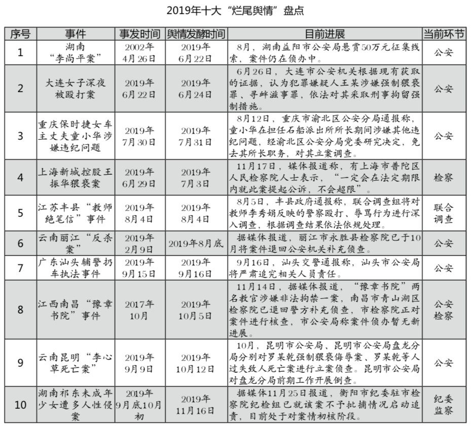 編者按:今年的網(wǎng)絡(luò)輿論場并不平靜,多起涉政法事件引爆輿論場,并發(fā)酵成為全網(wǎng)關(guān)注的熱點輿情,引發(fā)輿論震動。如備受輿論矚目的孫小果案、鄧世平案,從曝光之日起,就牽動著無數(shù)輿論目光。近日,相關(guān)涉案人員陸續(xù)受審獲刑,背后的“保護傘”也被立案調(diào)查。這類重大輿情事件不“爛尾”,體現(xiàn)出各級政法機關(guān)依法履行職責(zé)的自覺和擔(dān)當(dāng),值得稱道。然而也需看到,2019年接近尾聲,仍有不少輿情事件沒有掃尾,輿論場還遺留大量問號等待拉直。近年來,政法網(wǎng)絡(luò)輿情回應(yīng)率穩(wěn)步提升的前提下,輿情事件的處置完結(jié)率卻忽高忽低,2019年上半年不到六成事件有最終結(jié)果,遠(yuǎn)低于2018年全年75%的比率。鑒于此,法制網(wǎng)輿情中心(ID:fzwyqzx)盤點這一年的重大政法輿情事件,梳理出那些長時間沒有進展和結(jié)果的“爛尾輿情”,并通過分析其類型、總結(jié)其特征、剖析其危害,提出規(guī)避與應(yīng)對的建議,以供有關(guān)部門參考借鑒。