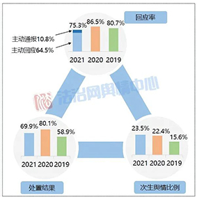 從回應主體來看,與2020年相比,由涉事部門進行回應的事件數(shù)量占比有所增加,達到62.9%,表明涉事主體主動作為的積極性有所提升;而上級主管部門介入回應的比重下降了近7個百分點,側(cè)面反映出涉事部門輿情應對能力在逐步精進,能夠較為及時遏制輿情擴散和波及的范圍,一定程度上減輕了級主管部門的應對壓力。同時,第三方回應的事件數(shù)量比重也略微提升了約2個百分點,顯示出不少輿情事件呈現(xiàn)復雜化特征,牽涉主體逐漸多元化并且覆蓋多個領(lǐng)域系統(tǒng),這對部門間的協(xié)調(diào)銜接工作也提出了更高的要求。此外政法機關(guān)內(nèi)部多主體回應的情況稍有減弱,相關(guān)案例所占比重較2020年減少了一半以上,為4.9%。