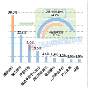 涉法輿情事件158起,占比95.2%。由刑事案件引發(fā)的輿情占比最高,達38.0%,其中惡性刑事案件占比24.7%,一般刑事案件占比13.3%。治安案件、民事糾紛、違紀違法通報引發(fā)的輿情分別占比22.2%、13.9%、4.4%。民事糾紛中,涉及婚姻問題尤其離婚的案事件同比較多,如福建連城縣法院發(fā)出首張“離婚冷靜期通知書”、湖南女子5年4次起訴離婚均被駁回、全國首例家庭勞務補償案宣判等。政策發(fā)布、公共安全事件引發(fā)的輿情分別占比3.8%、3.2%。此外,教育等行業(yè)亂象波及政法機關(guān)的輿情占比2.5%,其他輿情事件占比2.5%。