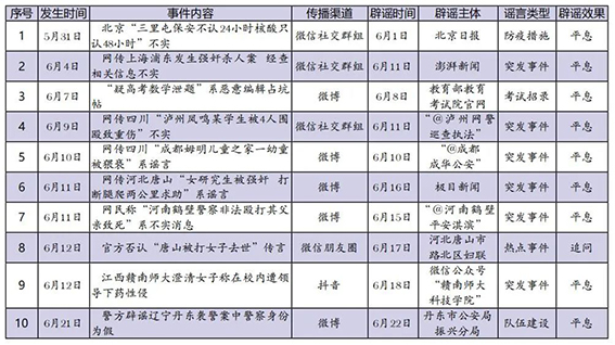 6月網(wǎng)絡涉法謠言辟謠榜單共梳理、匯總10起熱點事件,圍繞謠言持續(xù)時間、傳播渠道、產(chǎn)生地域、類型以及辟謠平臺等維度綜合分析,篩選兩起關注度較高、具有典型意義的案例研判,以期為網(wǎng)絡辟謠工作提供參考借鑒。