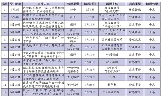從謠言內(nèi)容來看,5月涉疫謠言仍占多數(shù),但熱度及影響力有所降低,表明網(wǎng)民對謠言的甄別能力顯著提高。值得注意的是,部分涉疫謠言因情節(jié)離奇且具有較強的情緒煽動力,曝出后快速發(fā)酵,如網(wǎng)傳“北京一孕婦在醫(yī)院門口分娩”等謠言。當?shù)赜嘘P部門辟謠及時,有效消除誤會。本月,部分網(wǎng)民針對惡性案件、舊案積案造謠,通過渲染案情、捏造案件調(diào)查進展獲得關注,如編造“杭州下沙連環(huán)殺人”“浙財女生遇害”“‘南大碎尸案’告破”等謠言。所屬地公安機關主動澄清謠言,但部分輿論對舊案關注熱度仍有增無減,輿情多呈現(xiàn)“長尾效應”。本月境外媒體惡意造謠、抹黑我國現(xiàn)象較為凸顯,如敵媒編造“停辦護照”“綠卡剪角”傳言攻擊我國出入境管理措施等。對此,有關部門嚴正發(fā)聲,有力回擊不實報道。