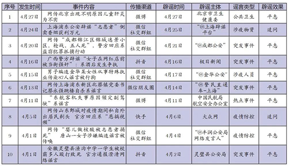 4月網(wǎng)絡涉法謠言辟謠榜單共梳理、匯總10起熱點事件,圍繞謠言持續(xù)時間、傳播渠道、產(chǎn)生地域、類型以及辟謠平臺等維度綜合分析,篩選兩起關注度較高、具有典型意義的案例研判,以期為網(wǎng)絡辟謠工作提供參考借鑒。