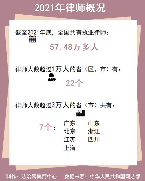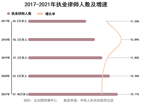 2017年至2021年,我國執(zhí)業(yè)律師人數(shù)每年都在以超過10%的速度增長。截至2021年底,全國共有執(zhí)業(yè)律師57.48萬多人,律師人數(shù)超過1萬的?。▍^(qū)、市)有22個,律師人數(shù)超過3萬的?。ㄊ校┯?個。