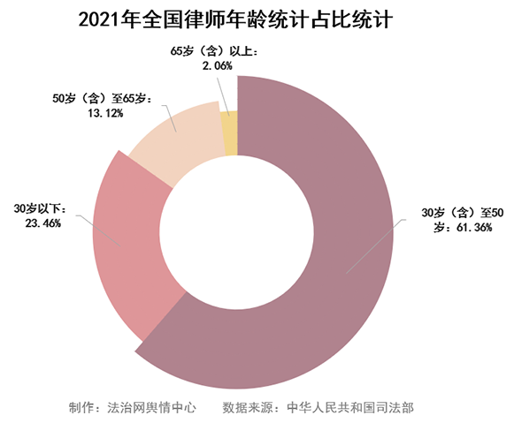 從年齡結(jié)構(gòu)來看,律師行業(yè)處于老中青共存階段。其中,30歲-50歲律師占比最高,達61.36%,30歲以下律師占比達23.46%,律師隊伍年輕化趨勢明顯。