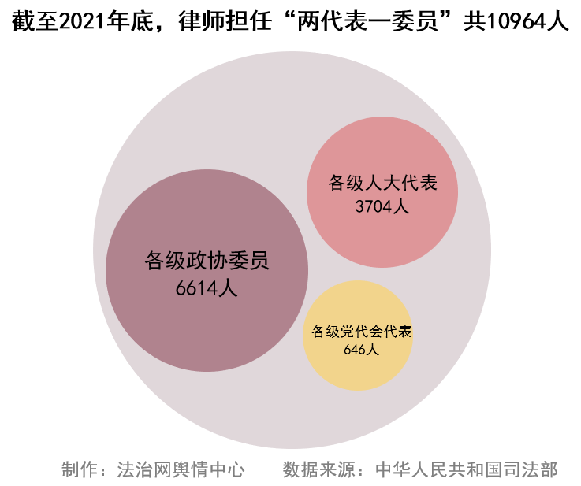 截至2021年底,律師擔(dān)任“兩代表一委員”共10964人,其中擔(dān)任各級人大代表3704人,擔(dān)任各級政協(xié)委員6614人,擔(dān)任各級黨代會代表646人。律師充分發(fā)揮職能優(yōu)勢,在全面依法治國中積極作為、履職盡責(zé)。