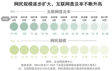 隨著互聯(lián)網(wǎng)的不斷普及,我國網(wǎng)民規(guī)模持續(xù)增長。據(jù)41次-50次(2017年12月-2022年6月)《報(bào)告》顯示,截至2022年6月,我國互聯(lián)網(wǎng)普及率已達(dá)74.4%,較2021年12月提升1.4個(gè)百分點(diǎn),網(wǎng)民規(guī)模達(dá)10.51億。