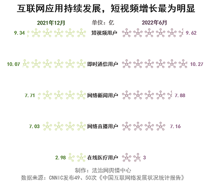 近年來,互聯(lián)網(wǎng)應(yīng)用場(chǎng)景得到極大豐富,短視頻既迎合了互聯(lián)網(wǎng)發(fā)展規(guī)律,又滿足了人們對(duì)多樣化的內(nèi)容需求,用戶數(shù)量不斷攀升。據(jù)第50次《報(bào)告》顯示,截至2022年6月,我國短視頻的用戶規(guī)模增長明顯,達(dá)9.62億,較2021年12月增長2805萬,其用戶規(guī)模增長量在即時(shí)通信用戶(2042萬)、網(wǎng)絡(luò)新聞?dòng)脩簦?698萬)、網(wǎng)絡(luò)直播用戶(1290萬)、在線醫(yī)療用戶(196萬)幾大群體中居首。
