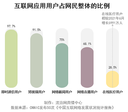 從總體規(guī)模來看,即時(shí)通信用戶規(guī)模達(dá)10.27億,占網(wǎng)民整體的97.7%。短視頻用戶緊隨其后,占網(wǎng)民整體的91.5%。網(wǎng)絡(luò)新聞?dòng)脩粽季W(wǎng)民整體的75.0%。網(wǎng)絡(luò)直播用戶占網(wǎng)民整體的68.1%。在線醫(yī)療用戶占網(wǎng)民整體的28.5%,隨著在線醫(yī)療需求的不斷釋放,在線醫(yī)療行業(yè)呈現(xiàn)出高速發(fā)展態(tài)勢(shì),截至2022年6月,在線醫(yī)療用戶規(guī)模較2021年6月增長5991萬。