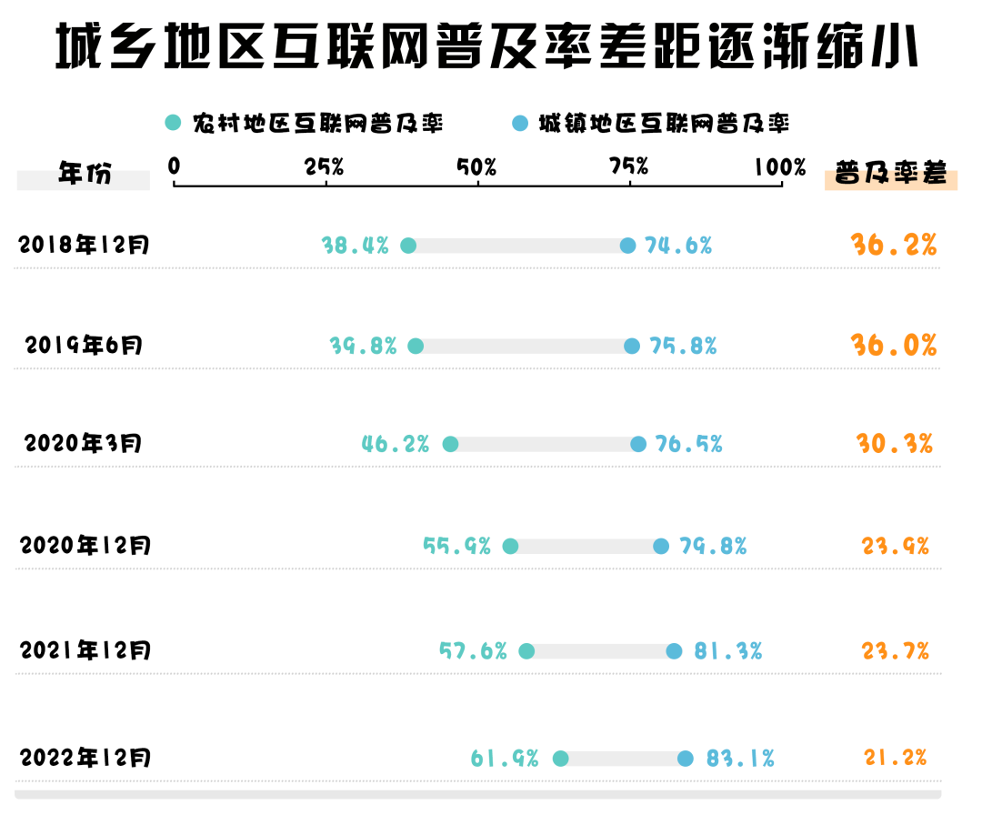 截至 2022 年12月,我國城鎮(zhèn)地區(qū)互聯(lián)網(wǎng)普及率為 83.1%,農(nóng)村地區(qū)互聯(lián)網(wǎng)普及率為61.9%,普及率差值為21.2%。城鄉(xiāng)地區(qū)互聯(lián)網(wǎng)普及率差異較 2021年 12 月縮小2.5個百分點。