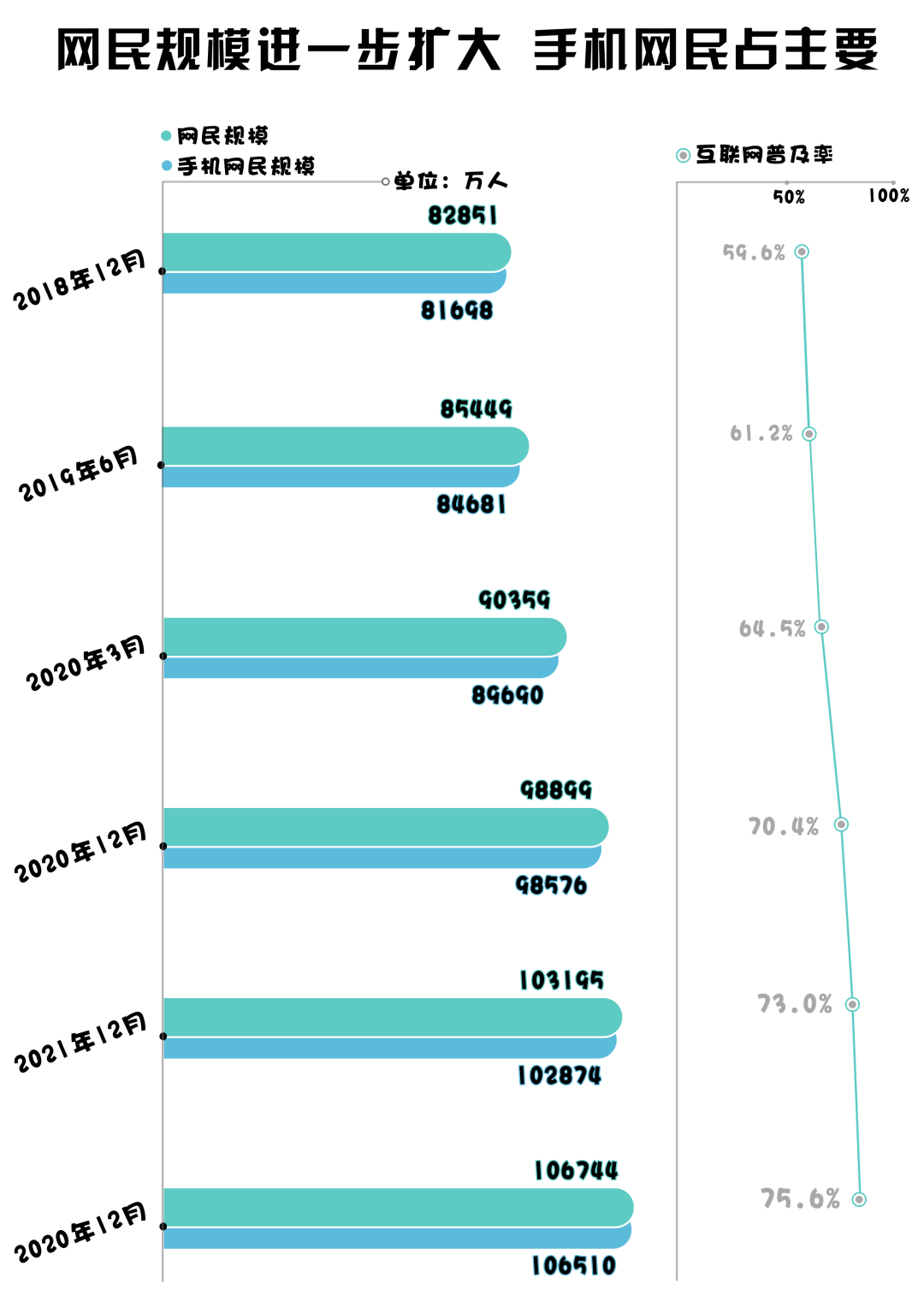 截至 2022 年 12 月,我國網(wǎng)民規(guī)模為 10.67 億, 互聯(lián)網(wǎng)普及率達 75.6%,其中,我國手機網(wǎng)民規(guī)模為 10.65 億,占整體網(wǎng)民規(guī)模的 99.8%。