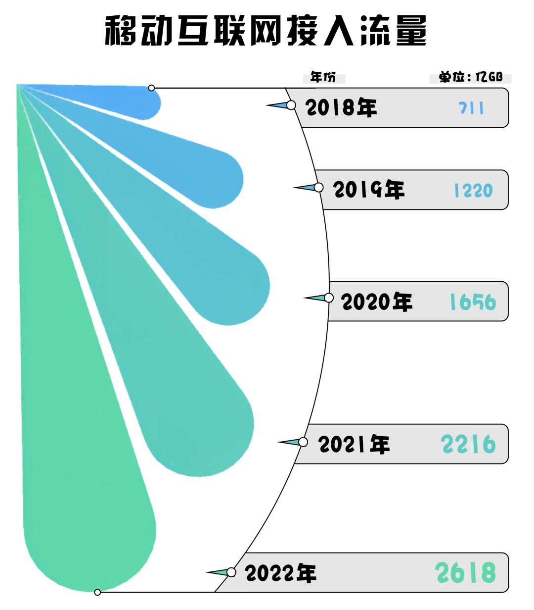移動互聯(lián)網(wǎng)是移動通信、互聯(lián)網(wǎng)二者的結(jié)合體,通過移動互聯(lián)網(wǎng),人們可以地鐵上使用手機、平板電腦等移動終端瀏覽新聞、刷短視頻等。2022 年,我國移動互聯(lián)網(wǎng)接入流量達 2618 億 GB,同比增長 18.1%。