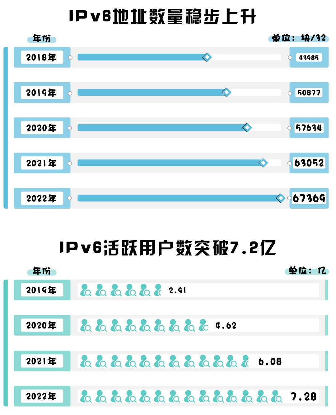 根據(jù)《報告》顯示,截至2022年12月,我國IPv6地址數(shù)量達到67369塊/32,連續(xù)5年遞增;IPv6活躍用戶達到7.28億,相較2021年增長1.2億。