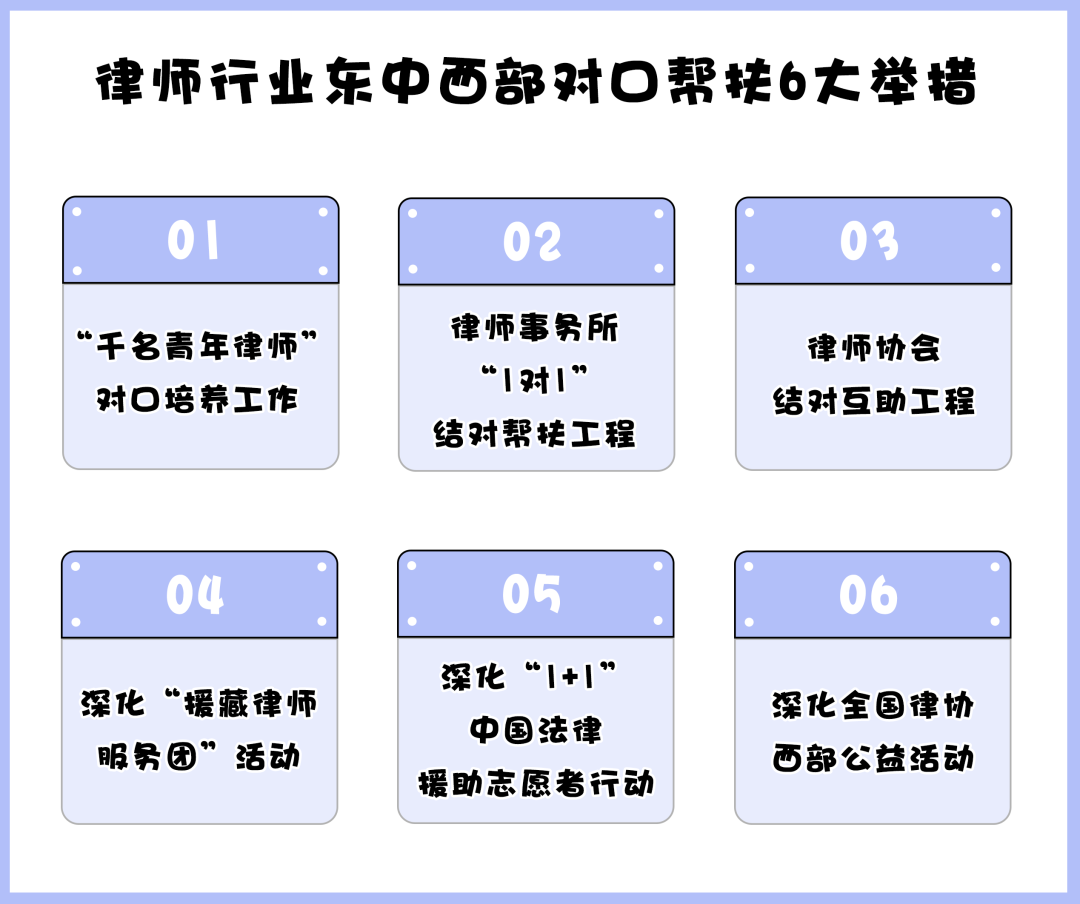 為有效推進(jìn)律師行業(yè)東中西部對(duì)口幫扶工作,《關(guān)于建立健全律師行業(yè)東中西部對(duì)口幫扶機(jī)制的方案》列舉了如下措施。