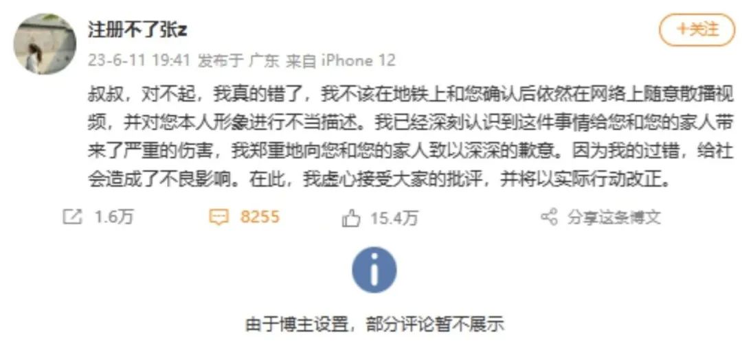 6月11日,被懷疑偷拍男子的兒子鄧某通過《南方都市報(bào)》發(fā)聲,稱父親是農(nóng)民工,當(dāng)天坐地鐵想在廣州轉(zhuǎn)轉(zhuǎn),未曾想到被當(dāng)做“猥瑣男”發(fā)到網(wǎng)上。他希望涉事女子公開道歉,否則將選擇起訴。該表態(tài)獲得大量網(wǎng)民支持。當(dāng)日,鄧某陪同父親到廣州鷺江站派出所報(bào)警,張某致歉,雙方再次達(dá)成和解。鄧某表示,她還是一名學(xué)生,公開道歉就好,不想影響她太多。當(dāng)日19時(shí)許,“@注冊(cè)不了張z”發(fā)博致歉,這條微博引發(fā)網(wǎng)民評(píng)論8000余條,但張某關(guān)閉了評(píng)論功能,僅顯示一條為其“站臺(tái)”的精選留言,很快有網(wǎng)民發(fā)現(xiàn)該賬號(hào)為張某小號(hào)。這一“操作”徹底激怒網(wǎng)民,有網(wǎng)民諷刺稱:“用專業(yè)優(yōu)勢(shì)帶風(fēng)向,發(fā)現(xiàn)‘失手’后先大號(hào)道歉,再小號(hào)帶節(jié)奏,不愧是傳媒學(xué)院的高材生。”如潮的質(zhì)疑聲中,張某所在的四川大學(xué)也遭遇壓力,不斷有網(wǎng)民頻繁催促校方處置此事。6月12日,四川大學(xué)再次回應(yīng)稱仍在調(diào)查,但否認(rèn)網(wǎng)傳將要開除涉事女生的信息,輿情熱度持續(xù)走高,并于6月14日觸頂。