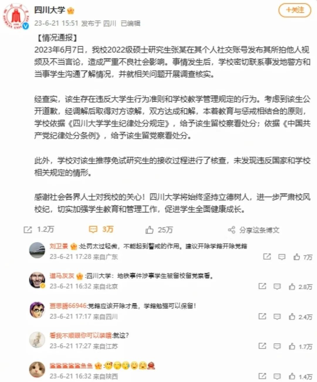 歷經(jīng)較長(zhǎng)的沉淀期后,6月21日,四川大學(xué)官微發(fā)布通報(bào)稱,最終給予張某留校和留黨察看處分。經(jīng)對(duì)張某保研過程進(jìn)行核查,未發(fā)現(xiàn)其違反國(guó)家和學(xué)校相關(guān)規(guī)定。多數(shù)網(wǎng)民不認(rèn)可此結(jié)果,認(rèn)為四川大學(xué)放任學(xué)生不當(dāng)行為,處置不公。有網(wǎng)民反問稱“明顯的造謠,為何僅以道歉結(jié)束”;還有網(wǎng)民認(rèn)為高校的教育機(jī)制和培養(yǎng)標(biāo)準(zhǔn)出現(xiàn)問題,質(zhì)疑如此品行的大學(xué)生將來進(jìn)入媒體,職業(yè)素養(yǎng)堪憂。大V“@老徐時(shí)評(píng)”指出:“造謠也好,拒不道歉也好,這些都屬于個(gè)人品德問題,并不是重點(diǎn)。這個(gè)事件的重點(diǎn),是后續(xù)被發(fā)現(xiàn)的保研等問題,關(guān)系到教育公平,關(guān)系到普通百姓的上升渠道和上升空間?!?月25日,北京一家律師事務(wù)所發(fā)布通報(bào),認(rèn)為四川大學(xué)的畢業(yè)生品質(zhì)難以信服,故該所不再招聘該校畢業(yè)生。部分網(wǎng)民對(duì)此叫好,部分人則認(rèn)為此舉涉嫌炒作和就業(yè)歧視?!癅人民日?qǐng)?bào)”評(píng)論呼吁,莫因個(gè)體案例為群體“貼標(biāo)簽”。