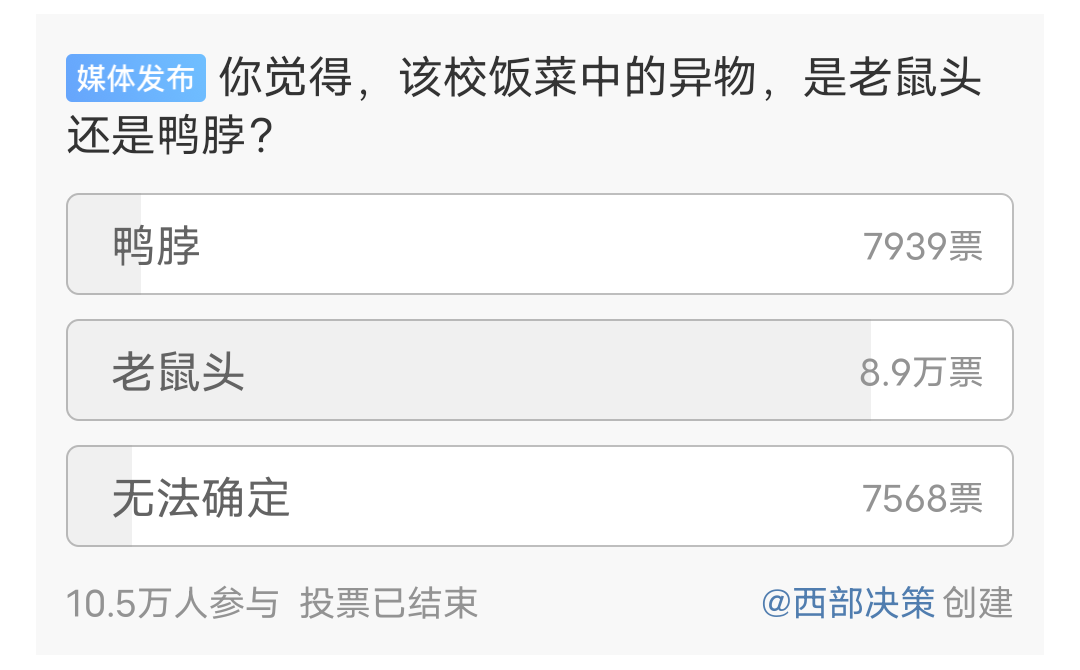 大量網(wǎng)民質(zhì)疑當(dāng)?shù)叵嚓P(guān)部門“指鼠為鴨”。據(jù)“@西部決策”發(fā)起的一項超10萬人參與的微博投票顯示,近九成網(wǎng)民認(rèn)為食堂中的異物為“鼠頭”,不少科普博主、微博大V還有媒體均就此事發(fā)表評論,輿論場基調(diào)以追問和批評為主。6月6日上午,微博話題“#長牙的鴨脖令人如鯁在喉#”沖上熱搜榜第一位。另據(jù)《河南商報》報道,有網(wǎng)民爆料該校一教職工疑似要求學(xué)生針對此事進(jìn)行“控評”。輿論場上,除了批評校方說謊、隱瞞等聲音之外,還有網(wǎng)民疑惑市場監(jiān)管部門為何替學(xué)?!罢九_”,猜測背后存在利益輸送等問題;也有網(wǎng)民拍攝視頻解釋稱,鴨脖在某個角度看起來很像老鼠頭;更多網(wǎng)民呼吁當(dāng)?shù)乇O(jiān)管部門拿出更多檢測證據(jù)來。