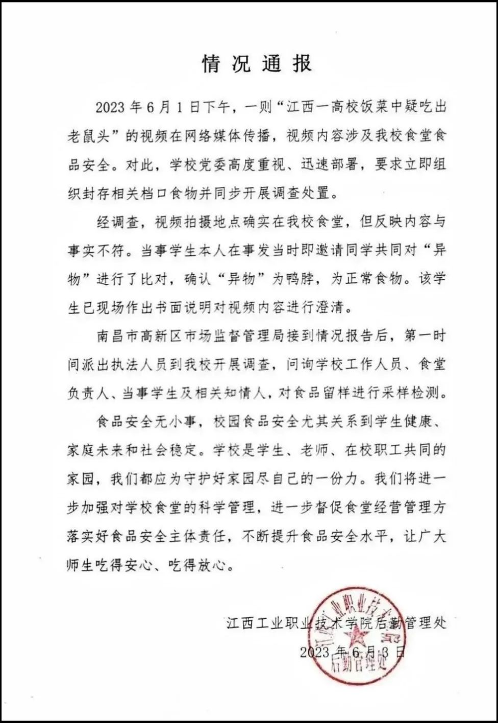 6月2日,據(jù)“@沸點視頻”稱,6月1日,網(wǎng)曝江西工業(yè)職業(yè)技術(shù)學(xué)院學(xué)生吃飯吃出來老鼠頭。據(jù)抖音短視頻顯示,一男子告知食堂工作人員吃出來老鼠頭,工作人員表示“是鴨肉”。報道稱,涉事的學(xué)校餐飲公司南昌市菁禾餐飲工作人員表示“已經(jīng)看到視頻了,會去調(diào)查核實處理”。隨后“@頭條新聞”等賬號轉(zhuǎn)載該新聞,部分網(wǎng)民留言評論表示“不信”,并調(diào)侃稱“說是鴨肉的那個讓他吃掉”。