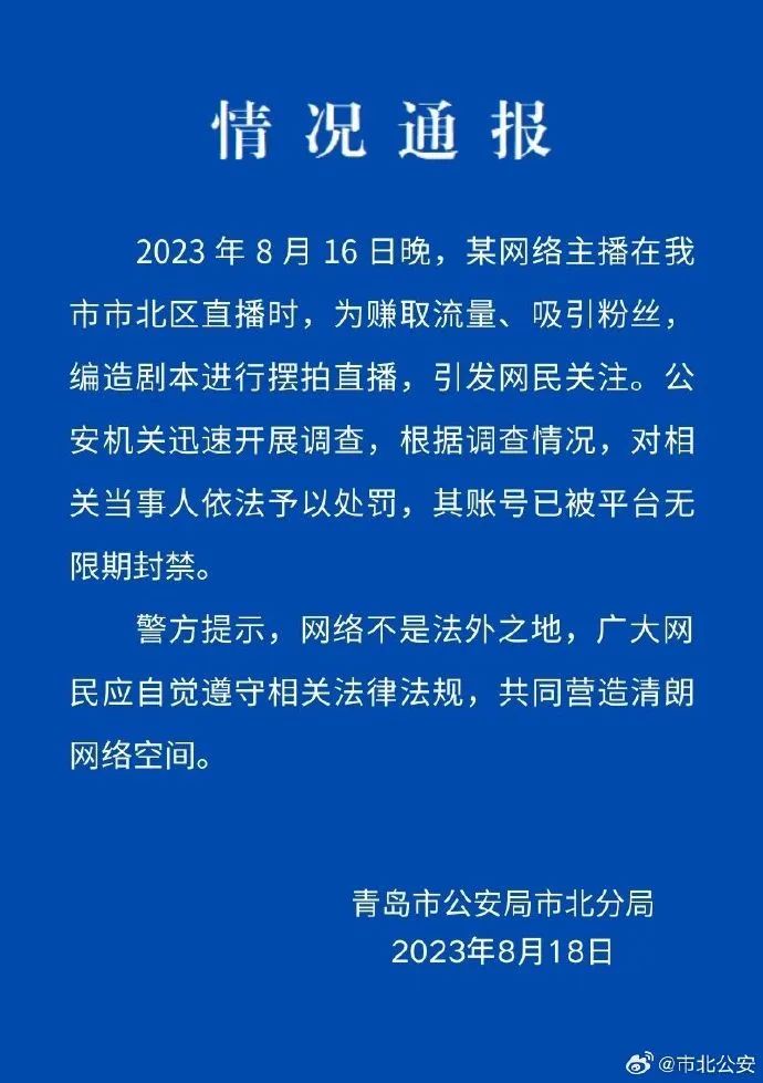 8月18日,青島市公安局市北分局微博賬號“@市北公安”通報稱,某網(wǎng)絡(luò)主播在青島市市北區(qū)直播時,為賺取流量、吸引粉絲,編造劇本進行擺拍直播。公安機關(guān)對相關(guān)當事人依法予以處罰,其賬號已被平臺無限期封禁?!?二驢#”“#警方通報網(wǎng)傳二驢直播被綁架#”等多個話題閱讀量近6.7億。輿論對此結(jié)果表示認同,評論稱“山東警方果斷調(diào)查處置,結(jié)果大快人心”。