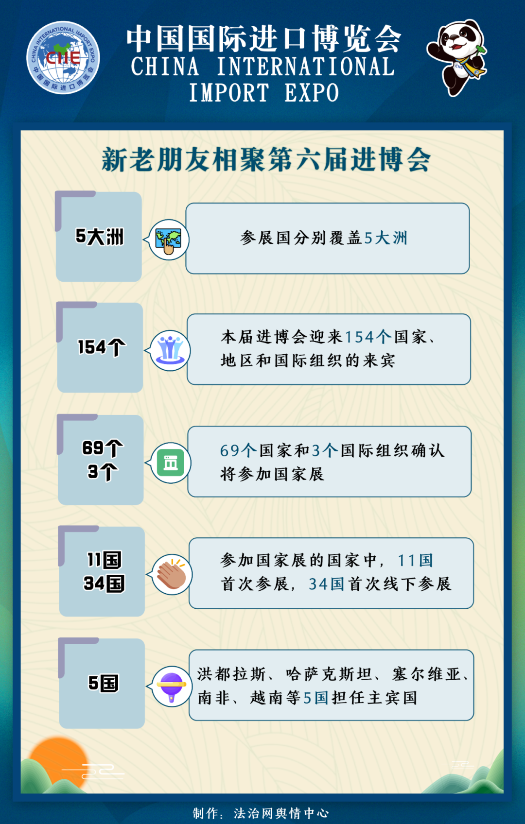 本屆進博會將迎來154個國家、地區(qū)和國際組織的來賓。其中國家展的參展國別覆蓋五個大洲。69個國家和3個國際組織確認將參加國家展。其中,11國首次參展,34國首次線下參展,洪都拉斯、哈薩克斯坦、塞爾維亞、南非、越南等5國擔任主賓國。