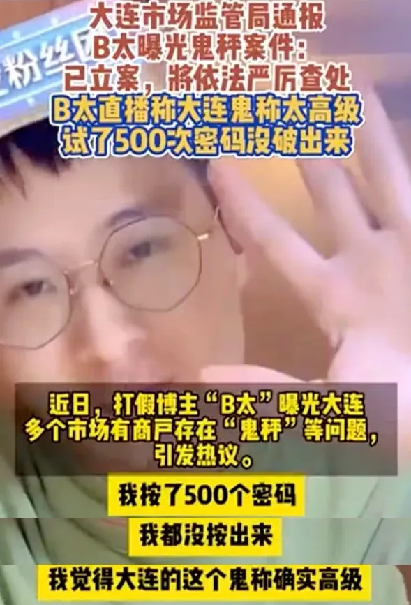 11月9日,“B太”發(fā)布實測海鮮加工餐廳的視頻,稱其到訪的3家海鮮加工商家均疑似在秤上做了手腳?!癇太”嘗試破解商家使用的“鬼秤”密碼時,被商家推搡,還遭威脅“把眼鏡給你砸了”;其撥打市場監(jiān)管局電話后,等待一個半小時仍無人到場,直到“B太”開啟直播,工作人員才姍姍來遲。“B太”出示相關視頻證據(jù),經(jīng)檢查該商家的電子秤雖然有強檢合格證,但沒有鉛封。而當“鬼秤”被帶到市場監(jiān)管局時,專業(yè)檢測人員只對“問題電子秤”進行簡單檢測后就宣布該秤“無問題”。當“B太”提出對電子秤進行密碼破譯時,檢測人員表示“我也跟著學習學習”,但“B太”嘗試了500多個密碼都未破解成功。次日,該電子秤被送往無錫檢測?!癇太”在微博和抖音平臺發(fā)布相關視頻,播放量迅速破億次,多數(shù)網(wǎng)民指責店家有恃無恐,質(zhì)疑市場監(jiān)管部門消極怠工;部分計劃去大連旅游的網(wǎng)民還表示,因擔心被“坑”將臨時改變目的地。
