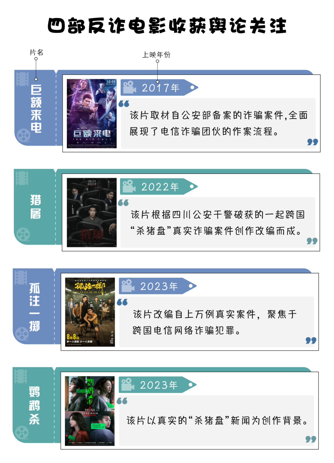 四部反電詐電影中,上映時(shí)間最早的是《巨額來電》,上映時(shí)間為2017年底,可以算作反電詐電影中的“前輩”。2022年5月10日,中宣部、公安部聯(lián)合啟動(dòng)“全民反詐在行動(dòng)”集中宣傳月活動(dòng),同年8月《獵屠》上映。2023年,公安機(jī)關(guān)對(duì)打擊電信網(wǎng)絡(luò)詐騙犯罪的力度不斷加大,宣傳力度隨之加強(qiáng),《孤注一擲》《鸚鵡殺》等兩部電影上映,引發(fā)輿論熱烈反響。以上四部電影均取材于真實(shí)案例,讓觀眾真實(shí)了解電信網(wǎng)絡(luò)詐騙的危害,進(jìn)而提升自身防范意識(shí)。