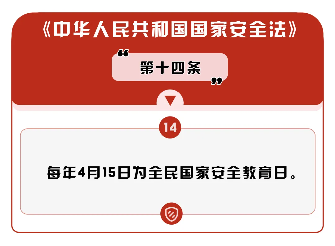 2015年7月1日,全國(guó)人大常委會(huì)通過(guò)的《中華人民共和國(guó)國(guó)家安全法》第十四條規(guī)定,每年4月15日為全民國(guó)家安全教育日。