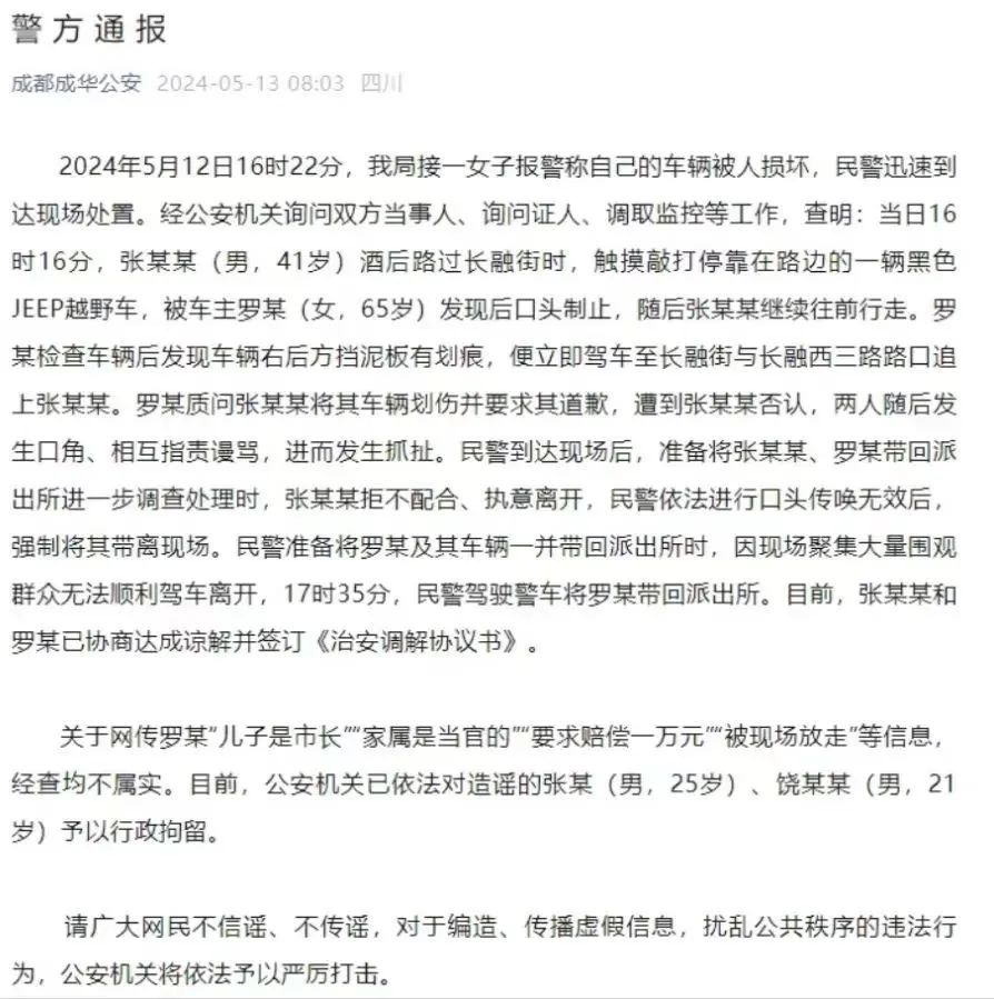 5月13日8時(shí)許,成都市成華區(qū)警方發(fā)布通報(bào)介紹事發(fā)過(guò)程,稱5月12日16時(shí)許,張某某(男,41歲)酒后觸摸敲打??吭诼愤叺牧_某(女,65歲)的車,雙方發(fā)生口角抓扯。張某某拒不配合、執(zhí)意離開(kāi),民警依法進(jìn)行口頭傳喚無(wú)效后,強(qiáng)制將其帶離現(xiàn)場(chǎng)。民警準(zhǔn)備將羅某及其車輛一并帶回派出所時(shí),因現(xiàn)場(chǎng)聚集大量圍觀群眾無(wú)法順利駕車離開(kāi)。目前,雙方已協(xié)商達(dá)成諒解并簽訂調(diào)解書(shū),網(wǎng)傳羅某“要求賠償一萬(wàn)元”“被現(xiàn)場(chǎng)放走”等信息均不屬實(shí),公安機(jī)關(guān)已依法對(duì)造謠的張某和饒某某予以行政拘留。該通報(bào)被光明網(wǎng)、“@四川日?qǐng)?bào)”等媒體轉(zhuǎn)發(fā)后帶動(dòng)輿情升溫,“#警方通報(bào)男子摸車被索賠1萬(wàn)#”等熱搜話題閱讀量累積近8000萬(wàn)次。部分網(wǎng)民調(diào)侃車主“神通廣大”,吐槽“以后停在路邊的車別亂摸”;有網(wǎng)民對(duì)通報(bào)內(nèi)容表示懷疑,追問(wèn)為何“把吉普車圍起來(lái)”等,還有網(wǎng)民呼吁公開(kāi)現(xiàn)場(chǎng)監(jiān)控?!癅作家劉小海”“@無(wú)心簡(jiǎn)影”等大V則力挺成都警方,反問(wèn)“成都市長(zhǎng)快60的人了,怎么可能有個(gè)65歲的媽”“難道不是因?yàn)楝F(xiàn)場(chǎng)有人煽動(dòng)造成人員聚集,怕現(xiàn)場(chǎng)失控才來(lái)了這么多警察嗎”。