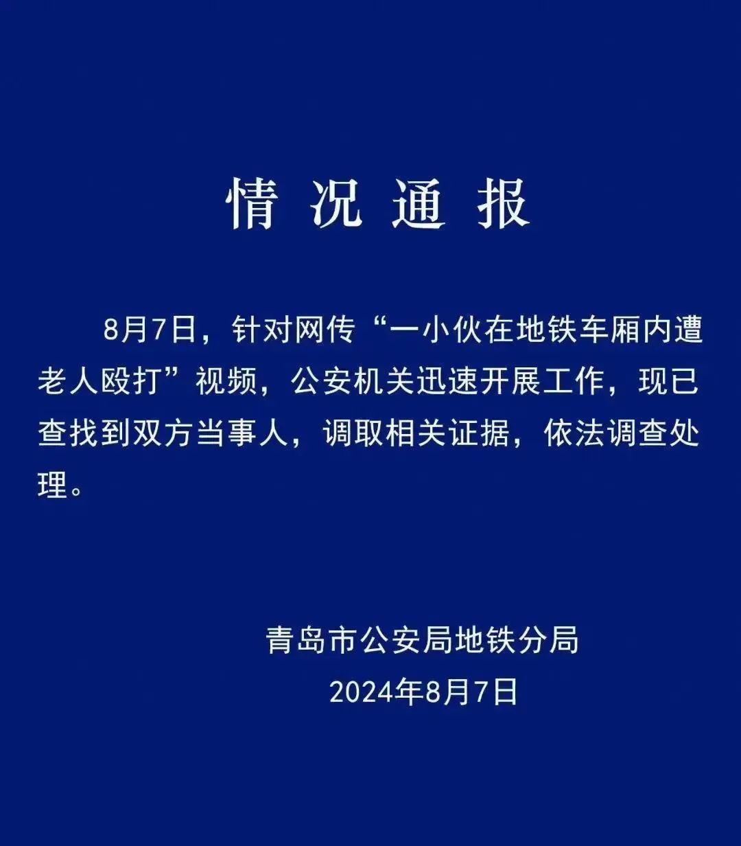 8月9日,微信公眾號(hào)“青島地鐵公安”再發(fā)通報(bào)詳述案情。通報(bào)稱,8月7日,和某城(男,23歲,無業(yè))乘坐地鐵期間對(duì)周圍多名乘客進(jìn)行言語(yǔ)滋擾,在對(duì)翟某緒(男,69歲,退休職工)進(jìn)行滋擾辱罵后,雙方發(fā)生肢體沖突,過程中和某城扯破翟某緒上衣,翟某緒擊打和某城面部。公安機(jī)關(guān)依法對(duì)和某城處以行政拘留處罰,翟某緒毆打和某城致其鼻骨粉碎性骨折,傷情損傷程度為輕傷二級(jí),涉嫌故意傷害罪,依法對(duì)其采取刑事強(qiáng)制措施,案件正在進(jìn)一步辦理中。
