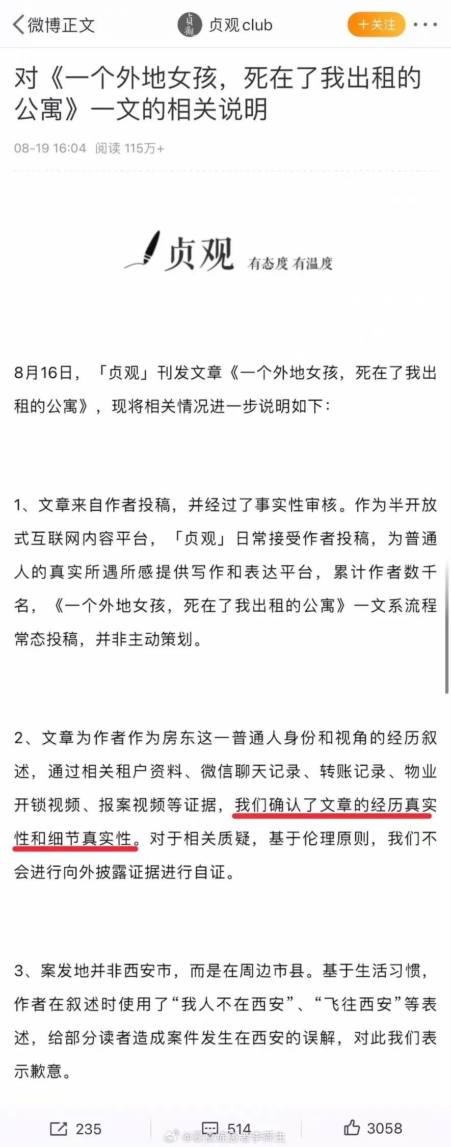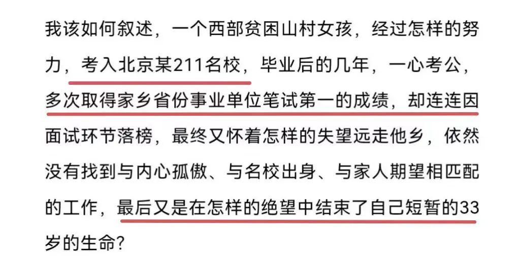 8月16日,微信公眾號“貞觀”發(fā)布一篇作者為“十二橡樹”的文章《一個外地女孩死在了我出租的公寓》。文章稱,今年4月,一名來自寧夏西海固山區(qū)的女孩租住了作者的單身公寓,她畢業(yè)于北京211高校,職業(yè)為會計,當(dāng)時正在陜西西安找工作。女孩畢業(yè)后一心考公,多次取得家鄉(xiāng)省份事業(yè)單位筆試第一的成績,卻一次次在面試環(huán)節(jié)落榜。6月25日,有人發(fā)現(xiàn)女孩疑似餓死在出租屋內(nèi),警方已介入處理。8月18日,“貞觀”以保護當(dāng)事人為由刪除該文章,并回應(yīng)稱文中所述為真實事件。8月19日,“貞觀”再次回應(yīng)稱文章來自作者投稿,經(jīng)過事實性審核,但案發(fā)地并非西安市,而是在周邊市縣。相關(guān)文章在社交平臺上引起熱傳,輿論呈現(xiàn)兩極分化:部分網(wǎng)民表示震驚和悲涼,借此對社會表達不滿;部分網(wǎng)民則對文內(nèi)相關(guān)細節(jié)的真實性提出疑問。
