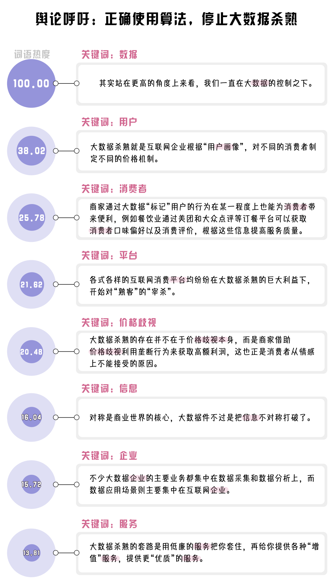 (制作:法治網(wǎng)輿情中心 數(shù)據(jù)來源:選取知乎問題“如何評價大數(shù)據(jù)殺熟這一現(xiàn)象?”下的1090個回答,對選取的回答進行數(shù)據(jù)清洗及自然語言處理,將熱度最高的詞語規(guī)定為100)