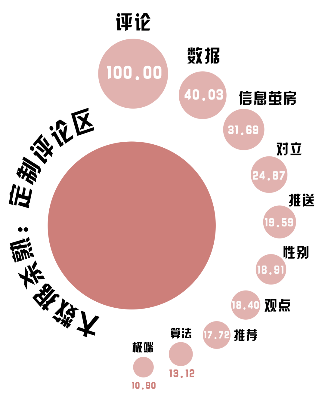 (制作:法治網(wǎng)輿情中心 數(shù)據(jù)來源:收集嗶哩嗶哩《大數(shù)據(jù)殺熟,評論區(qū)定制化有多恐怖?》下的2269條一級評論,對選取的回答進行數(shù)據(jù)清洗及自然語言處理,將熱度最高的詞語規(guī)定為100)