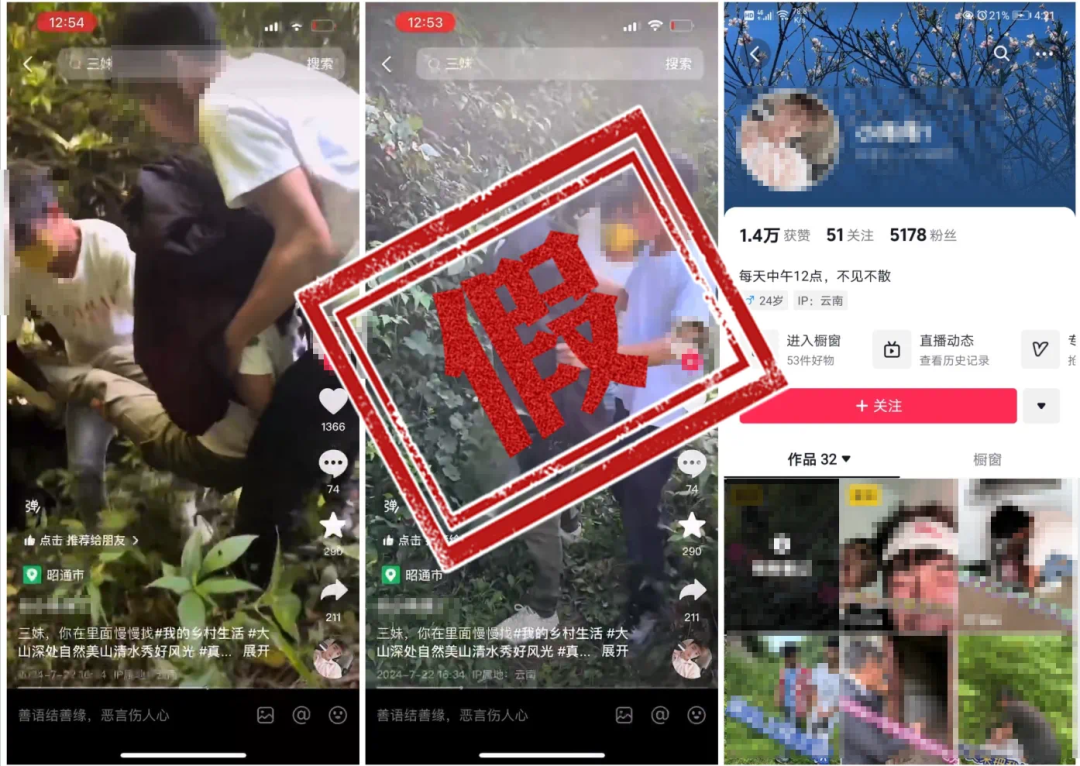 “婆媳勢不兩立”“婚姻一地雞毛”等以家庭矛盾為中心、以沖突為賣點的網(wǎng)絡(luò)虛假擺拍視頻并不鮮見,此類視頻往往密集制造沖突,放大家庭矛盾,且臺詞夸張、情節(jié)曲折。8月28日,抖音發(fā)布近期介入核實的網(wǎng)絡(luò)虛假擺拍典型案例,博主“是老王家的二姐呀”自稱在14歲至20歲期間被父母包辦3次婚姻,16歲時就和“大自己30歲的男子”生下兒子,并與幾個自稱“三妹”“大姐”的賬號互動頻繁,以矩陣賬號合力擺拍造假。涉事賬號被平臺采取封禁處理。10月,貴州畢節(jié)市七星關(guān)區(qū)網(wǎng)警與山東青島市網(wǎng)警先后通報“外來媳婦遭嫌棄毆打趕出家門后,躲進山洞艱苦求生”“臨盆孕婦被丈夫遺棄荒山數(shù)日,孤立無援,無法下山求救”兩起虛假擺拍案例,相關(guān)涉案人員均被當?shù)鼐浇o予行政處罰。