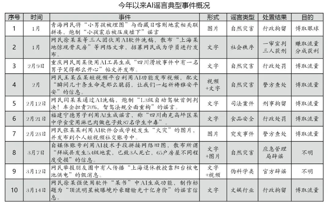 10起典型案例中,有4起AI謠言與自然災害相關,包括地震、山體滑坡等;2起謠言涉及食品安全和突發(fā)事件,分別為“四川某中學食堂用淋巴肉做包子致87名學生中毒”和“某地學校發(fā)生火災”;還有4起謠言分別涉及偽科學、文娛行業(yè)、社會秩序和司法案件四個方面。AI謠言表現形式較多,大多通過微博、微信、短視頻等社交媒體渠道擴散,并以文字、圖片、視頻形式單一或“搭配”傳播,比如“西藏定日縣地震一小孩被壓廢墟”謠言形式為圖片,“上海退休教授靠陽臺核電池供電”謠言則是以“文字+視頻”的形式傳播。造謠動機方面,有8起事件明確提到造謠者是為了蹭熱點、賺取流量收益,可見流量經濟仍然是AI謠言存在的底層邏輯。10起事件中,有2起事件被官方辟謠,但沒有其他情況通報,其余8起均有明確處理結果。處置結果方面,10起事件中有5起事件的造謠者被公安機關給予行政處罰或行政拘留,有2起事件進入到司法流程,網民閆某某因刻意炒作“國內首例智能駕駛致死案”,被屬地警方刑事拘留;網民徐某某等3人散布“上海某地驚現骨灰房”等謠言,獲利數額較大,被上海當地法院以非法經營罪判處有期徒刑一年十個月不等。