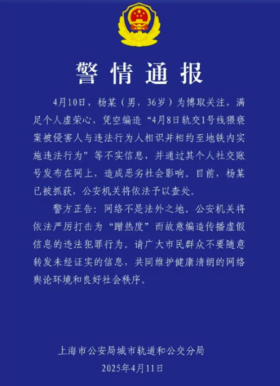 4月11日9時29分,“@軌交幺幺零”再發(fā)通報稱,男子楊某為博取關注,憑空編造“軌交1號線猥褻案男女雙方相識”謠言,發(fā)布到網(wǎng)上后造成惡劣影響,目前已被抓獲。官方通報再掀一波討論熱潮,微博轉評2萬余次、點贊超26萬次,“進去得好”“還是官方速度快”等評論獲得網(wǎng)民點贊認同。紅星新聞、極目新聞等媒體發(fā)文稱,“造黃謠和性騷擾都該人人喊打”;部分網(wǎng)民言論涉及性別對立話題,如“出手相助的是女的,猥褻造謠的都是男的”。截至4月17日12時,該事件相關輿情信息量超8萬條,“#上海地鐵一男子疑脫褲猥褻女乘客#”“#上海辟謠地鐵猥褻事件當事人相識#”等數(shù)十個關聯(lián)微話題累計閱讀量超6億。