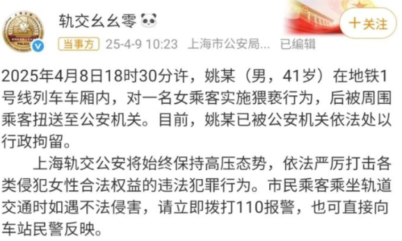 4月9日上午,多段網(wǎng)傳視頻引發(fā)關注,視頻顯示,上海地鐵一名女乘客疑似被猥褻,對身邊男子哭喊道“你把褲子脫了并弄到我身上”,同車女子稱“姐妹,我錄了視頻,我陪你去”。“@荔枝新聞”等媒體跟進報道,上海地鐵客服工作人員稱確有其事,網(wǎng)民痛斥男子“變態(tài)”“垃圾”。當日10時23分,上海市公安局城市軌道和公交分局官微“@軌交幺幺零”發(fā)通報稱,“4月8日18時30分許,姚某在地鐵1號線列車車廂內,對一名女乘客實施猥褻行為,被周圍乘客扭送至公安機關。目前,姚某已被公安機關依法處以行政拘留”。多數(shù)網(wǎng)民稱贊警方行動快速;部分網(wǎng)民表示不滿,認為行政拘留處罰較輕。4月10日,男子所在的工作單位發(fā)布公告,宣布將其開除。