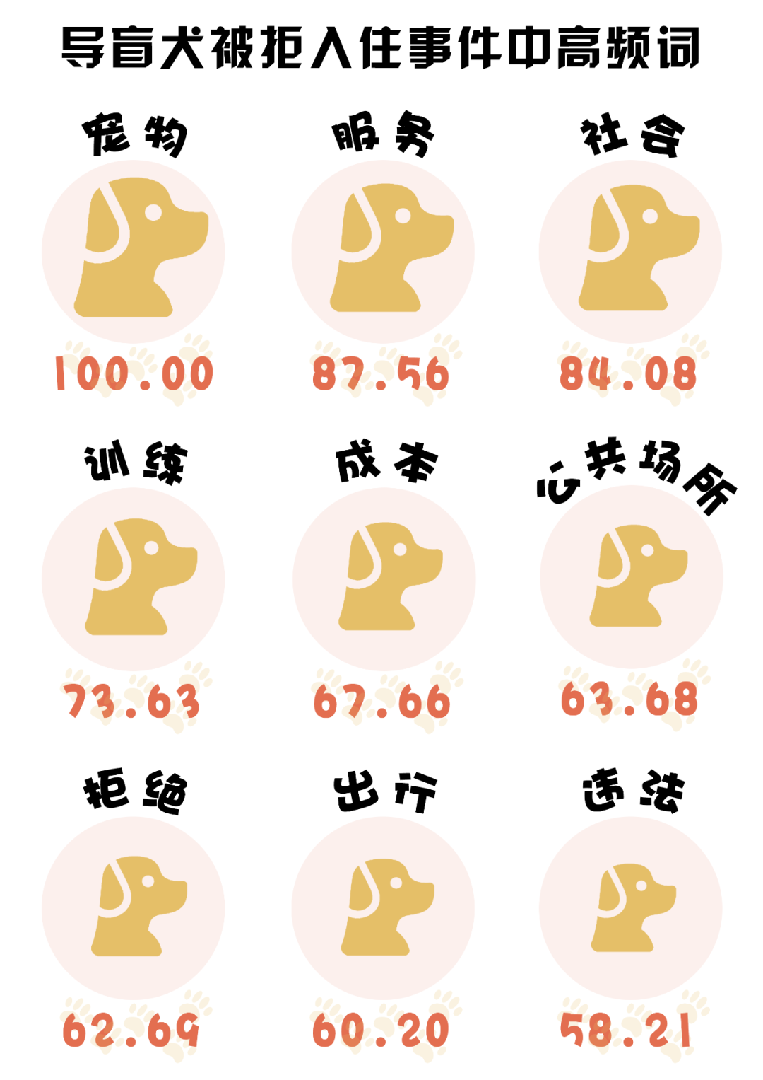 (數(shù)據(jù)來(lái)源:選取嗶哩嗶哩視頻《炒作、稀缺、奢侈品?為什么導(dǎo)盲犬被噴成了一場(chǎng)騙局?》下的6949條一級(jí)評(píng)論及彈幕,做分詞及歸一化處理,進(jìn)行分詞后將熱度最高的詞語(yǔ)規(guī)定為100)
