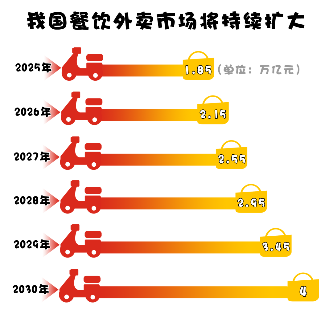 以外賣市場中的餐飲業(yè)為例,數(shù)據(jù)顯示,未來幾年,預(yù)計我國餐飲外賣市場規(guī)模將顯著增長,將從2025年的1.85萬億元一路攀升至2030年的4萬億元。這一持續(xù)拓寬的商業(yè)藍(lán)海,引得各家外賣平臺摩拳擦掌,“外賣大戰(zhàn)”不時打響。