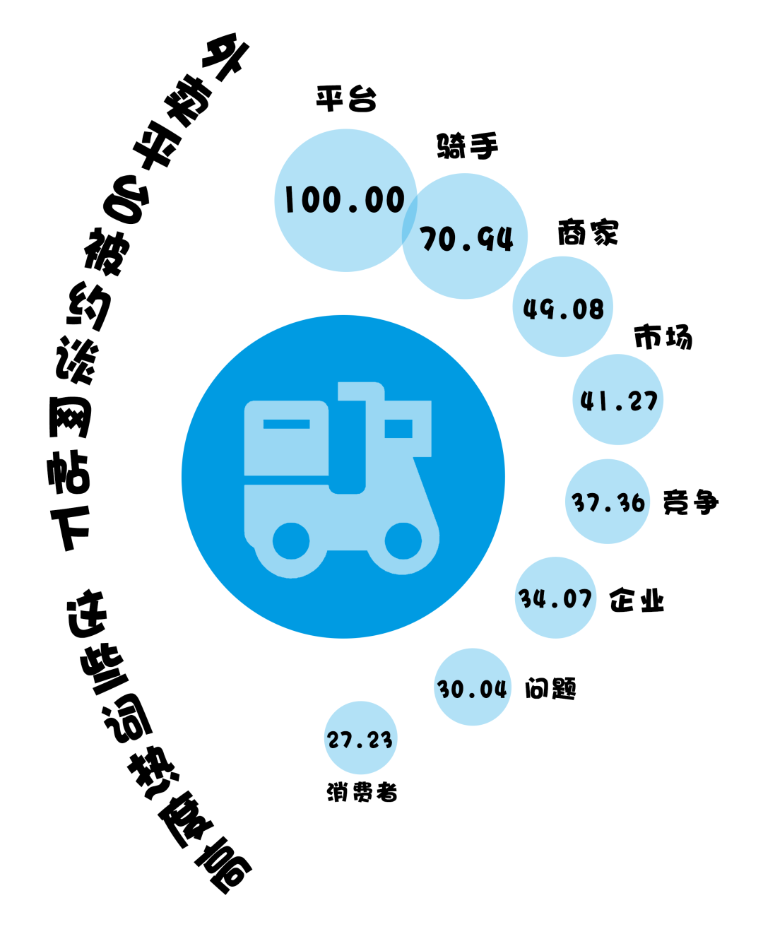 (數(shù)據(jù)來源:選取知乎話題“市場監(jiān)管總局等五部門約談京東、美團(tuán)、餓了么等外賣平臺企業(yè),釋放了什么信號?”下的659個回答,做分詞及歸一化處理,進(jìn)行分詞后將熱度最高的詞語規(guī)定為100)