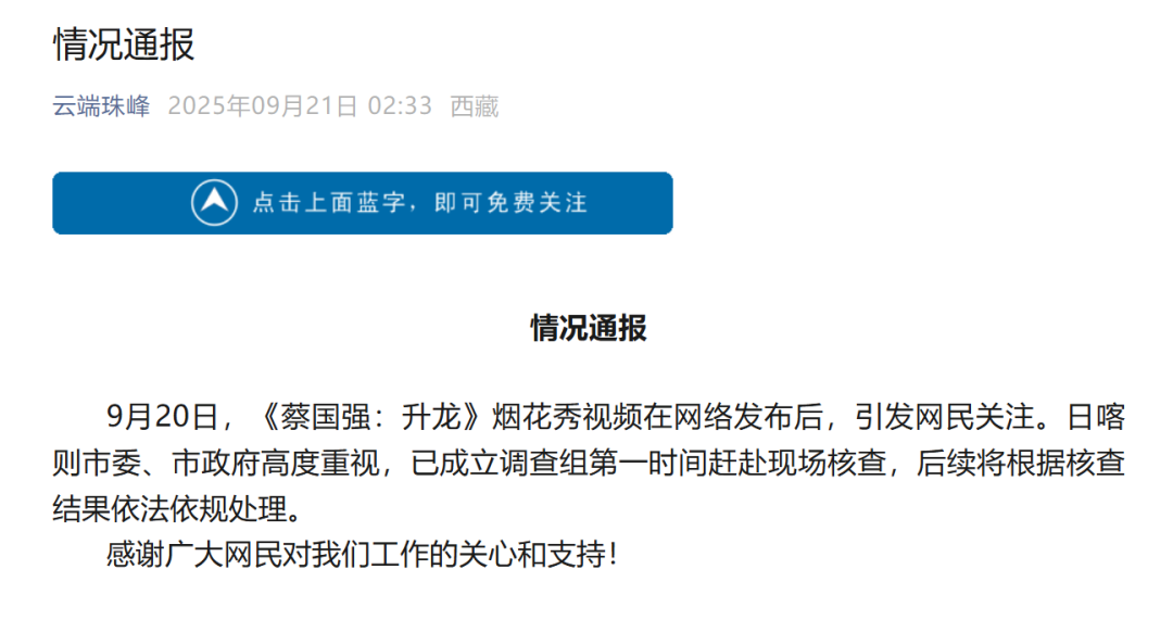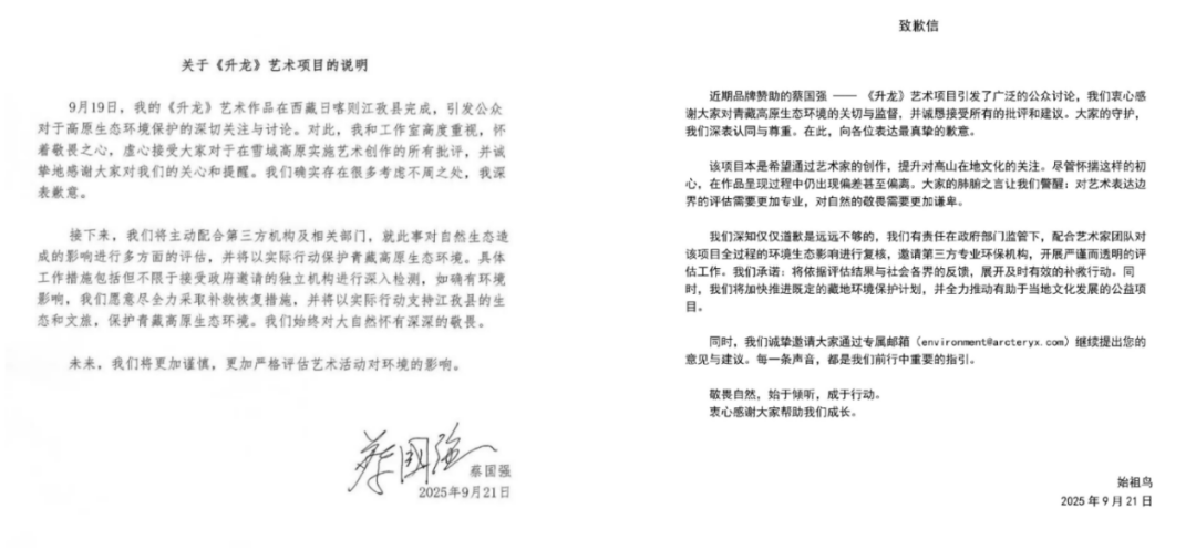 21日凌晨,日喀則市互聯(lián)網(wǎng)信息辦公室發(fā)布情況通報(bào)稱,日喀則市委、市政府已成立調(diào)查組第一時(shí)間趕赴現(xiàn)場核查,后續(xù)將根據(jù)核查結(jié)果依法依規(guī)處理。當(dāng)日,蔡國強(qiáng)工作室、始祖鳥分別發(fā)布致歉說明,蔡國強(qiáng)表示將“盡全力采取補(bǔ)救恢復(fù)措施”,始祖鳥則稱將邀第三方評(píng)估并依結(jié)果補(bǔ)救,同時(shí)推進(jìn)藏地環(huán)保計(jì)劃與文化公益項(xiàng)目。