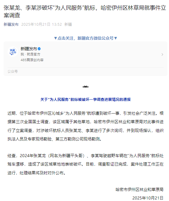 10月21日,新疆維吾爾自治區(qū)新聞辦公室官方微信號“新疆發(fā)布”發(fā)布通報,稱哈密市伊州區(qū)林業(yè)和草原局對此事件進(jìn)行了立案調(diào)查,對涉破壞航標(biāo)人員張某龍(網(wǎng)名為“新疆平頭哥”)、李某進(jìn)行了多次詢問,并到現(xiàn)場指認(rèn)處理結(jié)果將及時對外公布。人民日報、澎湃新聞、紅星新聞等轉(zhuǎn)發(fā)了通報內(nèi)容,輿情有所回溫。